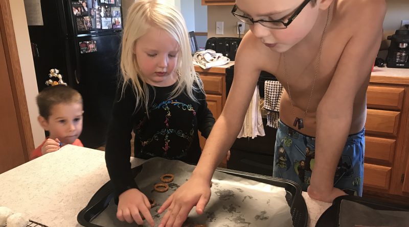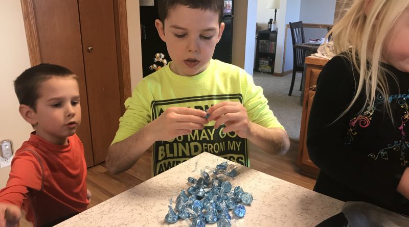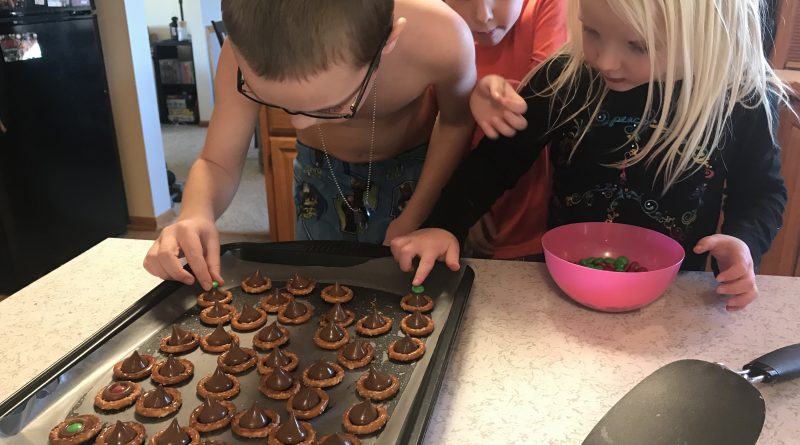 Today my wife was getting ready to host a Christmas party at our house and started making those M&M, Hershey Kiss & Pretzel thingies. I’ve heard them called M&M Kissed Pretzels or Pretzel M&M Hugs. Either way, they are apparently super easy to make and so she had the kids come in and help. They loved it! All they needed for ingredients are:
