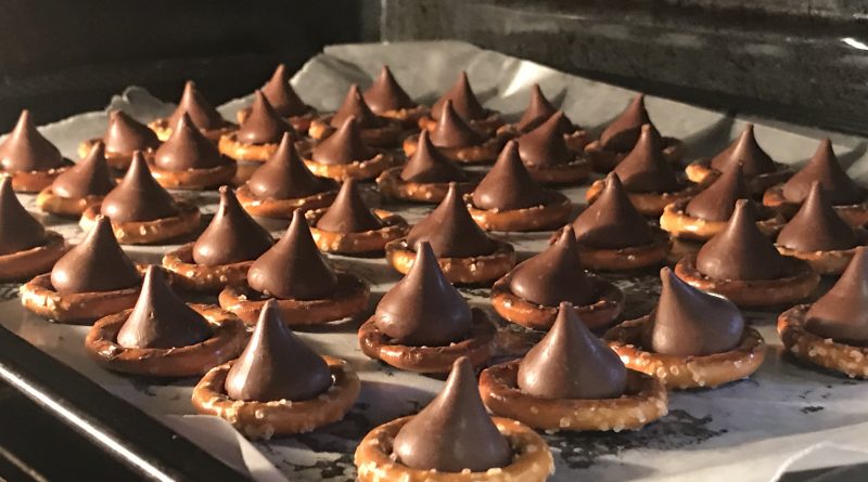 You just throw the Pretzel Rings on the cookies sheet and put a Hershey Kiss in each one. Then, put them in the oven at 170 degrees for about 5 minutes. Once they are out you just squish an M&M onto the top of the Hershey Kiss. Finish by putting them in the freezer for about 10 minutes to harden. That’s it! Just put them in a container until the event and then put them on some pretty dish you’ve been saving for such an event!